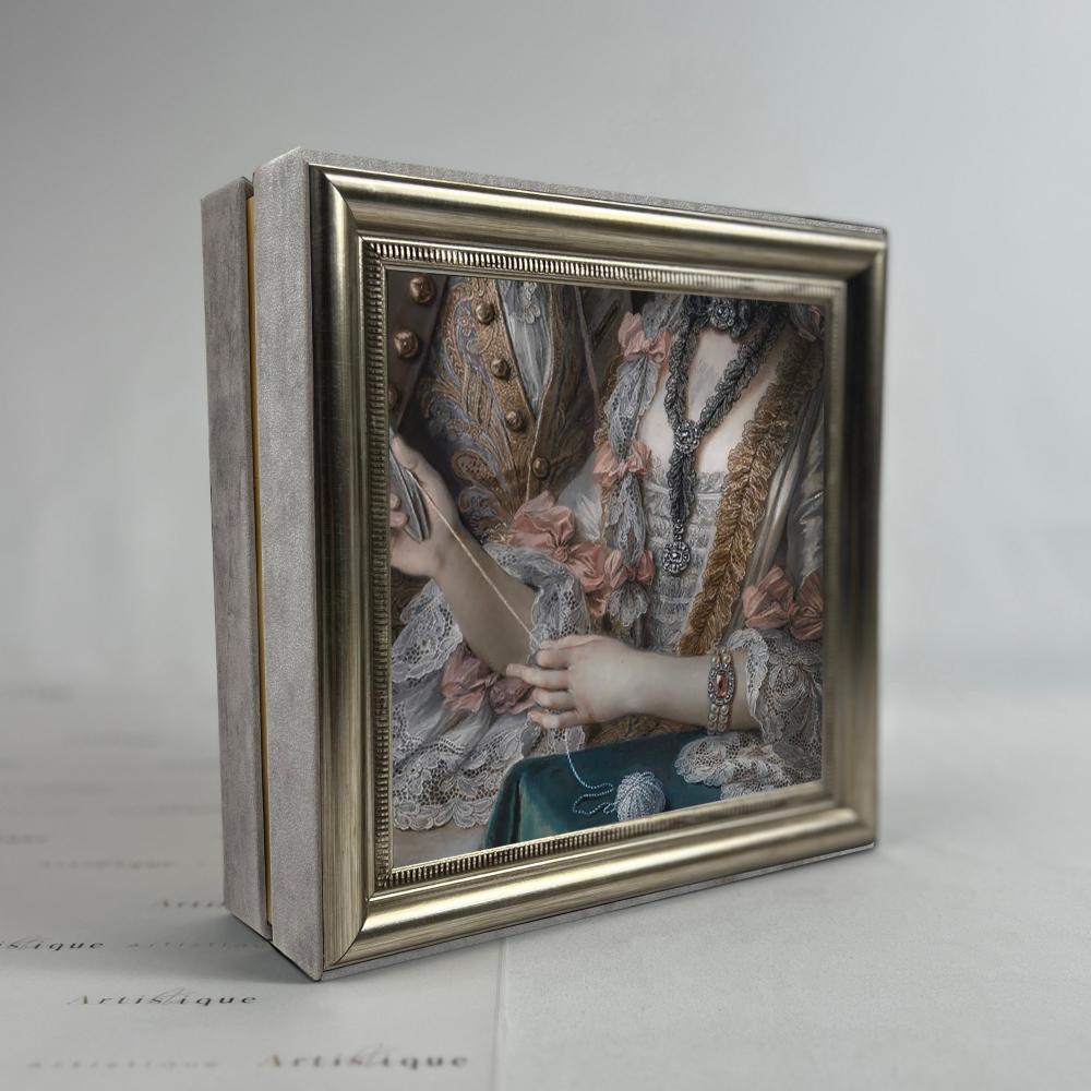 علبة فاخرة - تصميم "سدى" تجمع بين الفخامة والجمال بفضل الإطار الأنيق المزين بلوحة فنية مطبوعة على قماش كانفاس. هي الخيار المثالي لإضافة لمسة من الأناقة لديكور منزلك، أو كهدية مميزة.